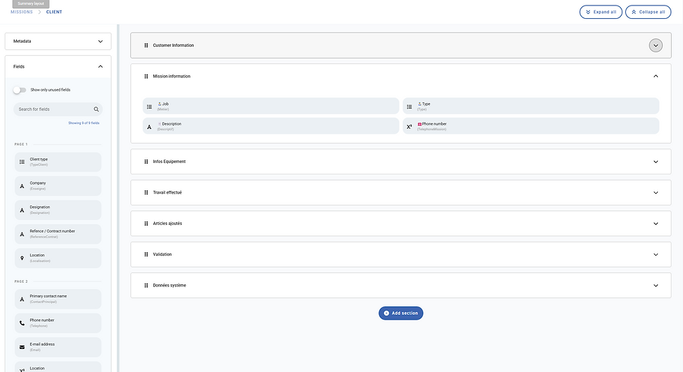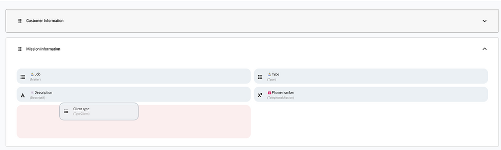Simply drag and drop the information you want to display onto the central panel, into a section. It is not possible to place information outside of a section.